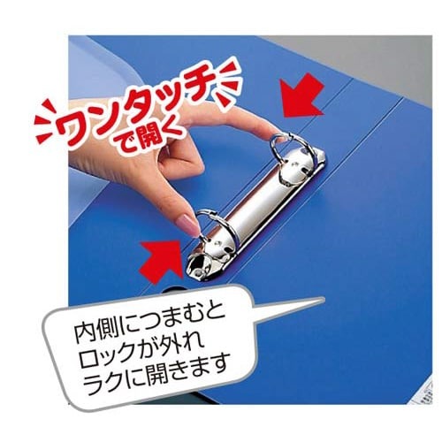 片手で簡単に開閉でき、手を挟んで痛い思いや怖い音のしない金属とじ具。棚から取り出しやすいフィンガーホール付き。表紙の裏に書類の仮保存に便利なポケット付き。