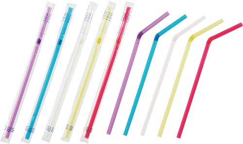 1本づつ個包装されているので、衛生的にご使用いただけます。飲みやすい曲がるストローです。イエロー・ピンク・ブルー・パープル・クリアのカラフルな5色アソートです。