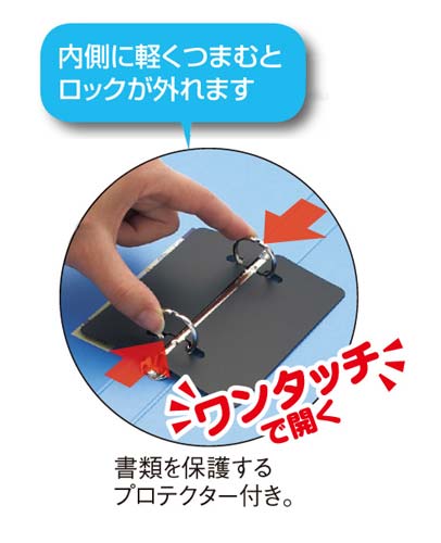 とじ具をワンタッチで開閉できるコクヨのリングファイル。内側をつまむとロックが外れラクに開きます。しっかりした貼り表紙タイプ!