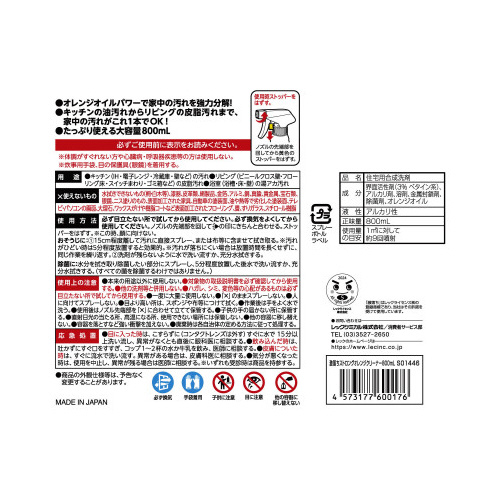 除菌家中まるごとオレンジクリーナー・オレンジオイルパワーで家中の汚れを強力分解!・キッチンの油汚れからリビングの皮脂汚れまで、家中の汚れがこれ1本でOK!