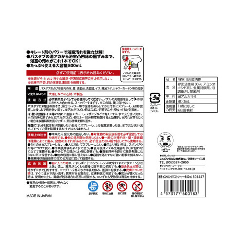 除菌浴室まるごとバスクリーナー・キレート剤のパワーで浴室汚れを強力分解!・バスタブの湯アカから浴室凸凹床の黒ずみまで、浴室の汚れがこれ1本でOK!
