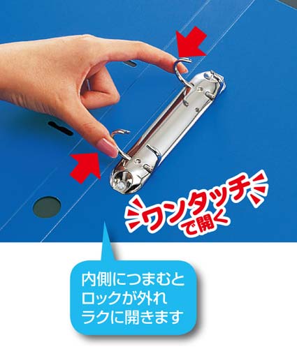 リングを内側につまむとロックが外れラクに開きます!Dリングなので、書類の抜き差しがしやすく、書類の端をそろえた保管も可能。棚からスムーズに取り出しができるフィンガーホール付き。