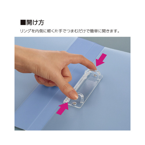 軽い力でワンタッチ操作できる、使いやすい樹脂製とじ具です。フック式のとじ具構造で、書類をしっかりとキープ。明るく清潔感のある5色の透明PP表紙。とじ具はD型リング状で、書類の閲覧もスムーズです。