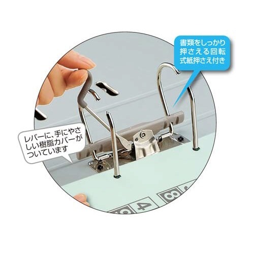 リングとじ具をレバーでラクに開閉できるレバーアーチファイル。レバーには樹脂カバーが付いているから、手にやさしくて使いやすい。