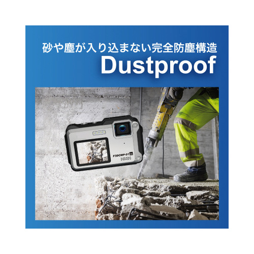 防塵防水等級IP68に準拠したコンパクトカメラ。砂や埃の侵入を防ぎ、1mからの落下にも耐えるタフなボディ。前面と背面にモニターを搭載、背面のメインモニターには大きく見やすい2.8型の液晶画面を搭載