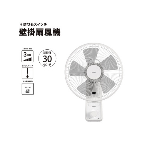 羽根径30cmの壁掛け式扇風機。脱衣所等の狭い場所でも設置できる。風量調整3段階。左右方向80度の首振り運転。