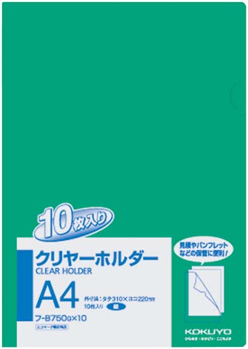 クリヤーホルダー、同色10枚パックです。目的別に分類でき、パンフレットなどの収容・保管の際に便利です。
