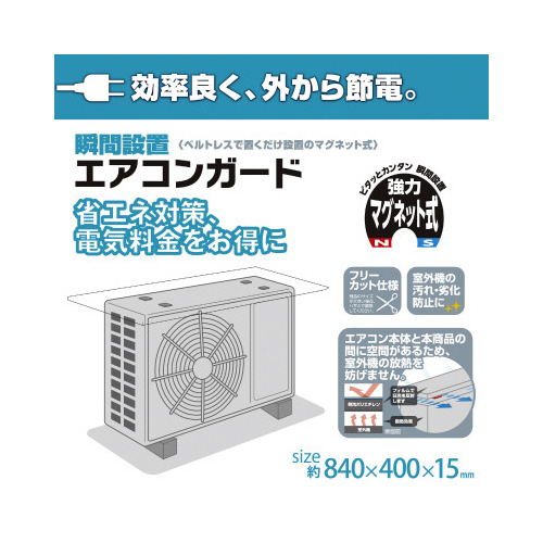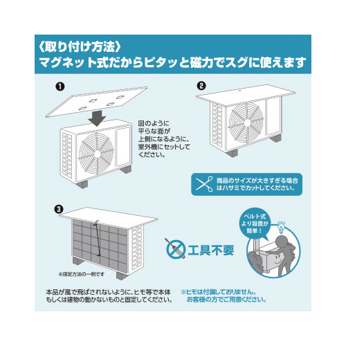 工具不要のエアコン室外機用カバー。ベルトレスで置くだけ設置。直射日光を防ぎ、室外機の温度上昇を抑える。省エネ対策、電気代をお得に。好みのサイズに切れるフリーカット仕様。