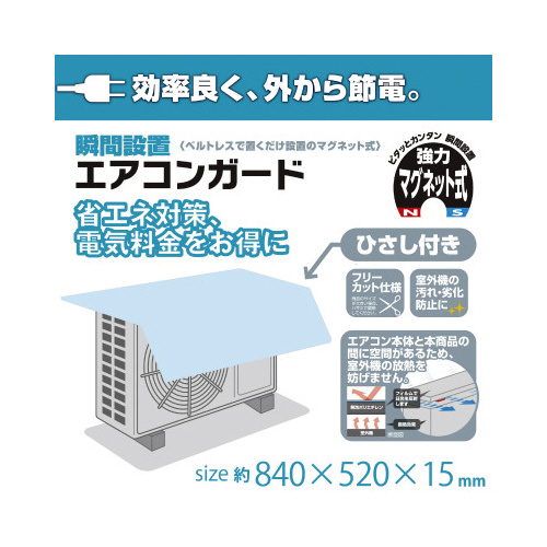 工具不要のエアコン室外機用カバー。ベルトレスで置くだけ設置。直射日光を防ぎ、室外機の温度上昇を抑える。省エネ対策、電気代をお得に。好みのサイズに切れるフリーカット仕様。