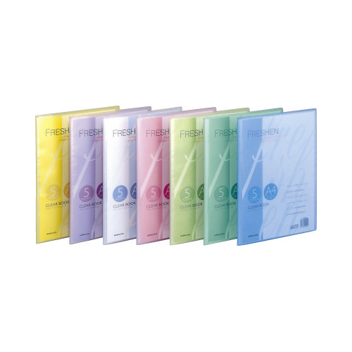POPで爽やかな印象の透明カラーを採用したコクヨのクリヤーブック「フレッシェン」。薄いので持ち運びに便利。表紙が透明なので、提出ファイル用の見出し表紙として使えます。