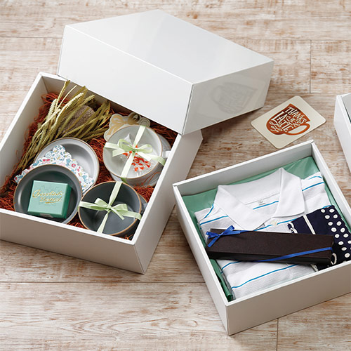 宅配100サイズ対応の正方形のギフトボックスです。蓋も下箱も貼合で強度もバッチリです。
