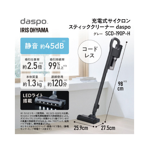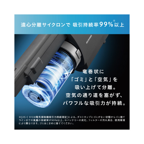 新設計のダストポケットつきヘッド搭載で運転音を気にせず掃除ができます。「ちりとりモード」では運転音が約45dBと図書館で使えるほど静かで約120分の長時間掃除が可能。バランスの取れた機能の掃除機です。