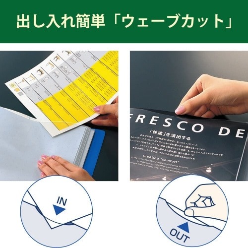 書類の出し入れがしやすいウェーブカットポケット採用の固定式クリヤーブック。棚などからのファイルの出し入れがしやすいフィンガーカット付きで便利。厚口のポケットなので耐久性にも優れています。