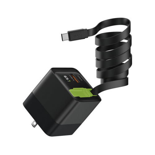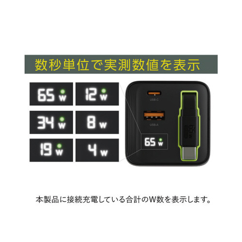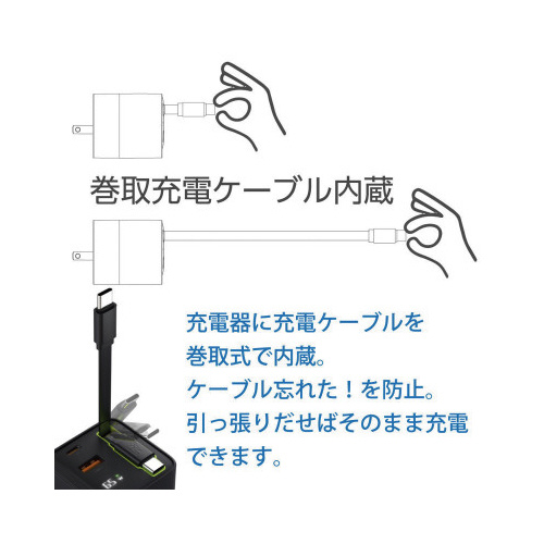 出力ポートにTypeC(メス)、USB-A(メス)と、巻取り式TypeC(オス)ケーブルを内蔵。充電中の合計W(ワット)数をLED表示。TypeCポートは最大65W出力で、3台同時充電時も対応