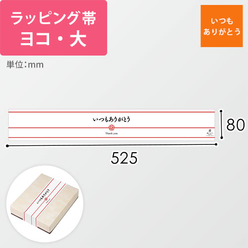 のし(熨斗)のように掛けて使えるラッピング用の帯。「いつもありがとう」のデザイン入りです。お誕生日や母の日、父の日、敬老の日、入園・入学、卒園・卒業といった特別な日のギフトラッピングにいかがでしょうか。