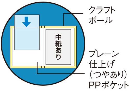 ベーシックな表紙を選ぶならクラフトタイプがオススメです。不透明表紙、中紙ありタイプ。背とポケットが溶着されている固定式です。