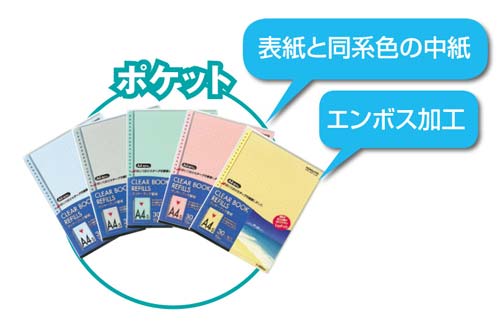 コクヨクリヤーブック(ラ-720シリーズ)の表紙と同系色の中紙付きリフィルポケット!エンボス加工です。