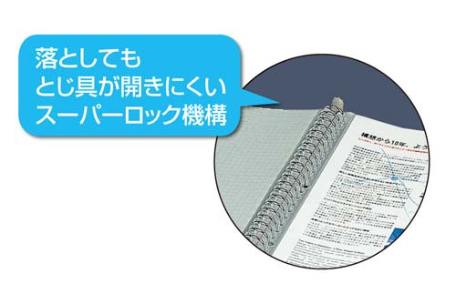 表紙が厚くて、しっかりしたタイプ。落としてもとじ具が開きにくいスーパーロック機構になっています。中紙ありタイプ。