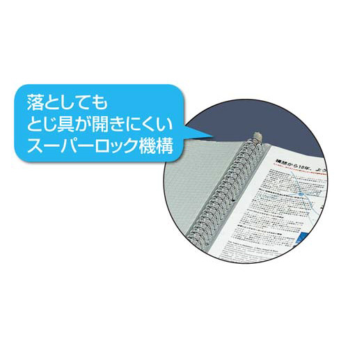 表紙が厚くて、しっかりしたタイプ。落としてもとじ具が開きにくいスーパーロック機構になっています。中紙ありタイプ。