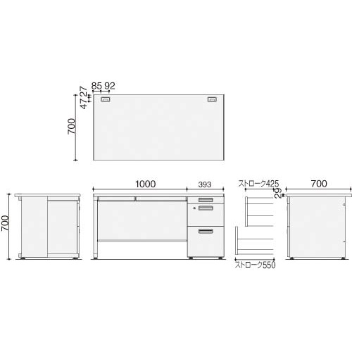 ●材質/天板:(表面)メラミン化粧板(芯材)スチール(エッジ)サイド・後ろ:ABS、脚:スチール(焼付塗装)、袖:(表面)スチール(焼付塗装)、鏡板:ABS、アジャスター:PA
