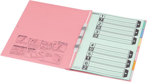 ガバット・背幅伸縮ファイルに使用しても、見出し山がはみ出ることがなく使えます。第3山と第4山の間に隙間があるから、つづりひもでのファイル固定ができます。書類分類がしやすい6色(6山)。