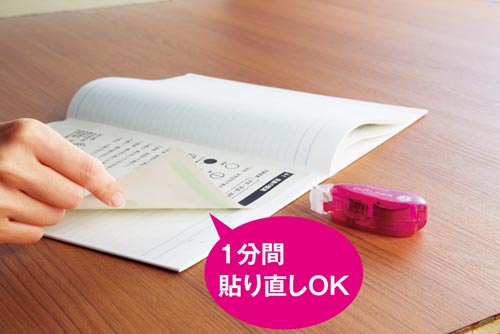 1分間貼り直しOK!貼った直後は弱粘着、時間がたつと強粘着でしっかり貼り付く。資料をノートに貼る時などに最適。しわにならずにきれいに位置合せできます。