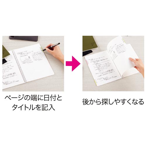 コクヨ独自開発のやわらかリングが、書くときリングに手が当たっても気になりにくいリングノート。ページ端に日付とタイトルが書けるエッジタイトル欄付きなので見出しになり、見たい記録をすぐに探せます。