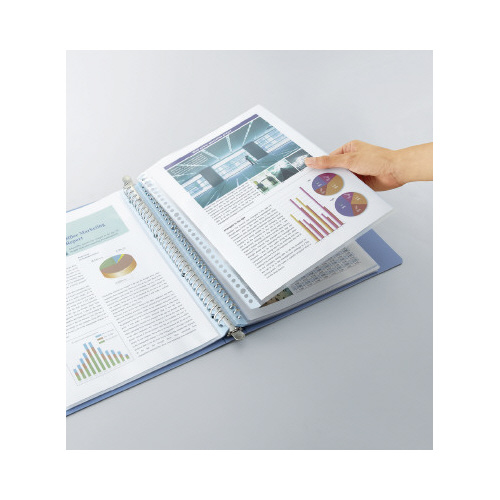 表紙に軽くてたわみにくい発泡PPシートを採用したクリヤーブック。スーパーロック機構だから、ファイルを落としても書類の脱落の心配がありません。