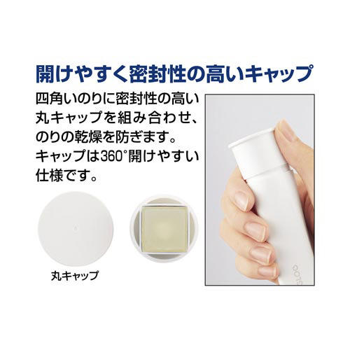 四角いから角にも細部にも塗りやすく、机の上でも転がりにくい。キャップは360°開けやすく、四角いのりに気密性の高い丸キャップを組み合わせてのりの乾燥を防ぐ。シワが出にくい「シワなくキレイ」タイプ