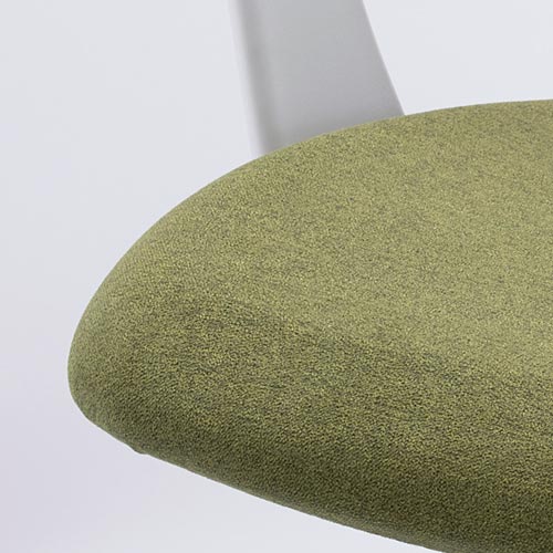 優しい生地感と白フレームは空間を明るく演出。女性でもしっかりフィットするサイジング。背面は包み込むようなフォルム、裏側はメッシュで通気性がよく見た目も軽やか。座面はもっちりとしたモールドウレタン採用。