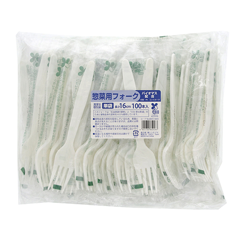 コーンスターチ40%をプラスチック材に配合した、環境にやさしいエコなカトラリーです。フォークタイプ。入数:100本。