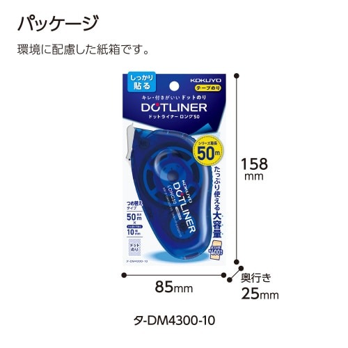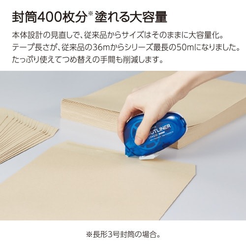 封筒約400枚分※塗れる、シリーズ最長テープのり(※長形3号封筒)。大容量だからつめ替えの頻度も減る。廃棄プラ重量を従来品から約50%削減。大型封筒にも安心の10mm幅。ドットタイプでのり切れ良し。