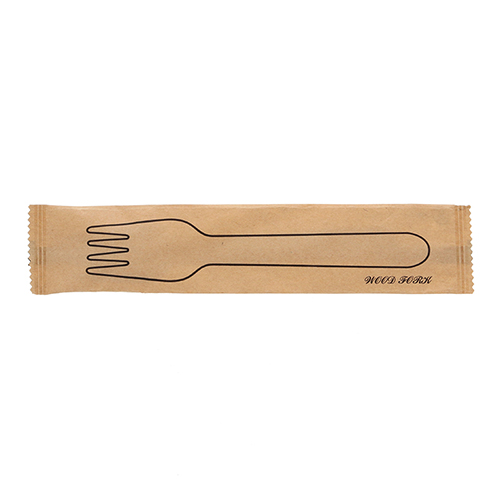 木製フォークに未晒紙製の単袋で包装を施した環境配慮の脱プラカトラリー。個包装の袋もすべて可燃ゴミとして廃棄できます。入数:100本。