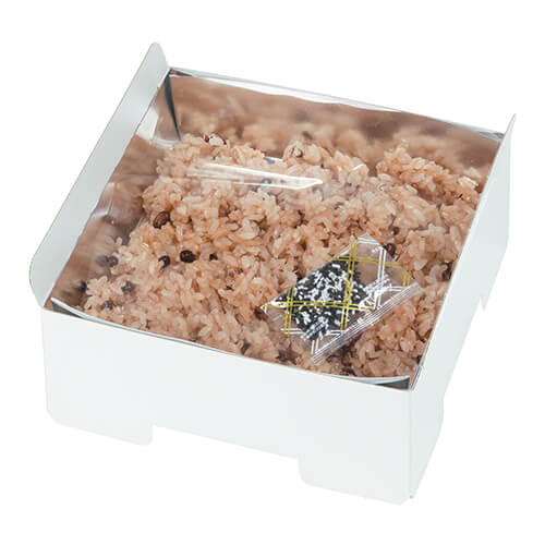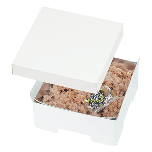サイズが160×160×55(40)mmのお菓子向けギフトパッケージ。赤飯にちょうど良い大きさとなっています。和菓子類のパッケージ、ギフト包装にいかがでしょうか。