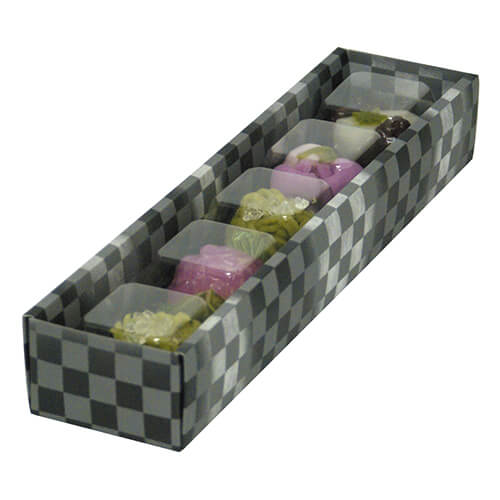 サイズが62×304×45mmのお菓子向けギフトパッケージ。和菓子5個にちょうど良い大きさとなっています。和菓子類のパッケージ、ギフト包装にいかがでしょうか。
