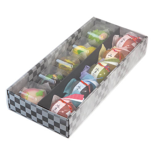 サイズが125×304×45mmのお菓子向けギフトパッケージ。上生菓子や水まんじゅうの詰め合わせにちょうど良い大きさとなっています。和菓子のギフト箱にいかがでしょうか。