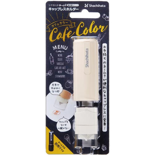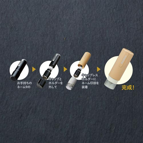 お手持ちのネーム9を、キャップレスタイプのネーム印に着せ替えできる「ネーム9着せ替えパーツキャップレスホルダー」。キャップの取り外しの手間がかからないので、ワンタッチでの捺印が可能。