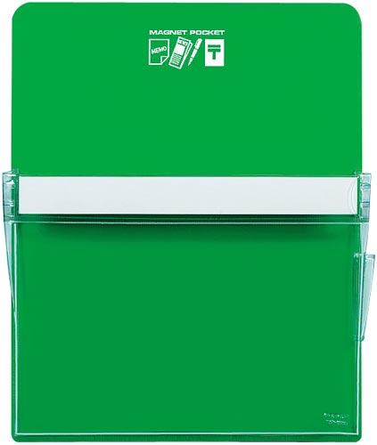 金属面に貼り付けられるマグネットタイプの書類用ポケット。ポケットの中身が記入できる差換式大見出し付きです。