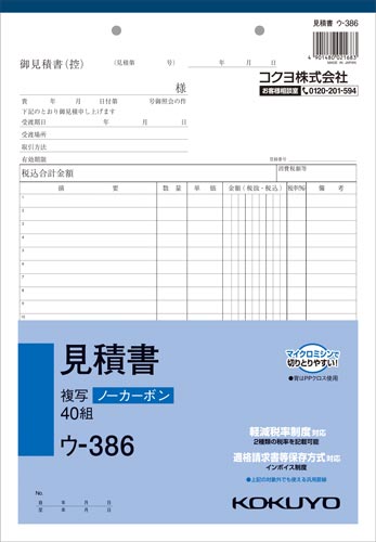 ●仕様/2枚複写/ノーカーボン/切/消費税欄付・軽減税率対応/22行/2穴(幅80mm)/40組