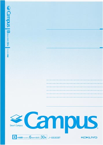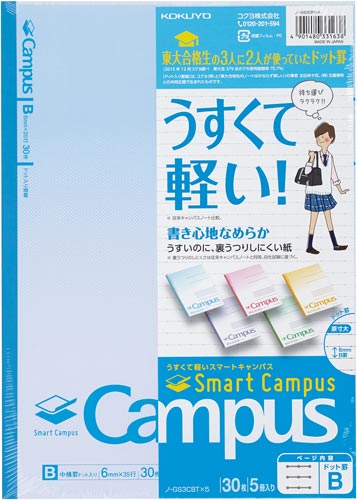 薄くて軽いキャンパスノート<スマートキャンパス>。薄いのに裏うつりしにくく、なめらかに書ける。従来のキャンパスノートより平滑度の高い紙を使用しており書き心地なめらか。ドット入り罫線。