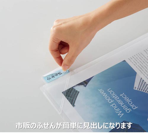市販のふせんでカンタンに見出しを付けることができるクリヤーホルダー。見出しをつけると、書類がさがしやすくなります!カバー付きなのでふせんが傷みません。差し込むだけで書類の脱落を防止するストッパー付き。
