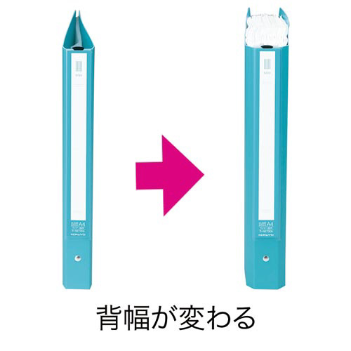 「背幅が変わる」機能と「ガイド機能付き専用ポケット」により従来品に比べて約1.5倍のポケットを収容することができます。レバーを立ててとじ具をロックすれば衝撃でリングが開いてしまうことがありません。