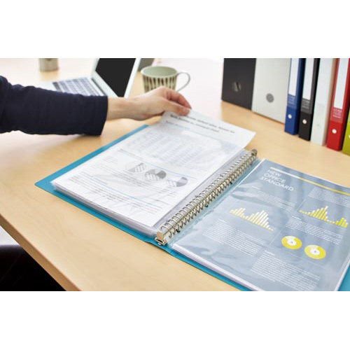 「背幅が変わる」機能と「ガイド機能付き専用ポケット」により従来品に比べて約1.5倍のポケットを収容することができます。レバーを立ててとじ具をロックすれば衝撃でリングが開いてしまうことがありません。