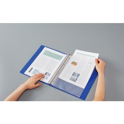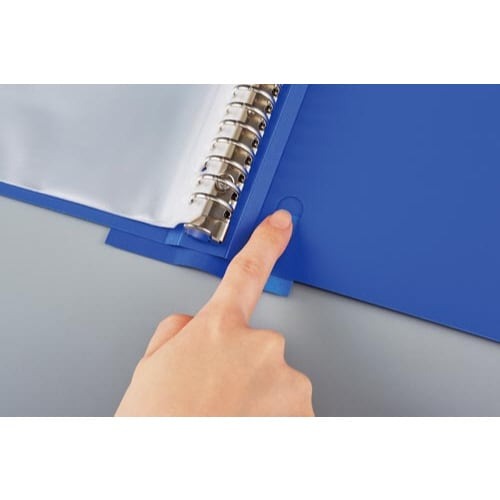 ポケットを追加できる替紙式のクリヤーブック、2段階に背幅を広げられ、収容量が少ないときはスリムに、収容量が増えてもかさばらずにキレイに収容可能