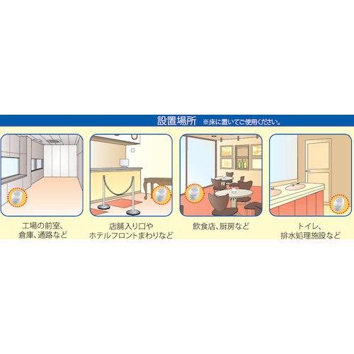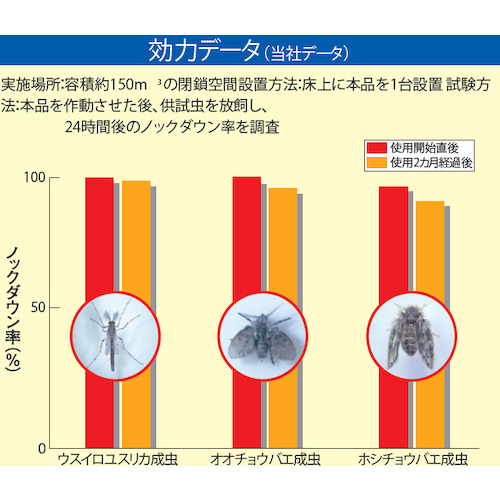 - AC電源で拡散性効果の安定性に優れ、24時間連続使用で約60日間(約1500時間)の防除及び殺虫が可能です。