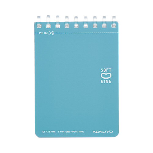 コクヨ独自開発の“新感覚やわらかリング”を採用したリングノート。必要なページだけをきれいに切り離せる、マイクロミシン目入りのカットオフタイプ。ドット入り罫線を採用。