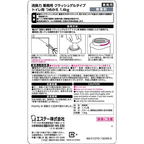 Sanityは消臭力に生まれ変わりました。細かいクラッシュゲルが、悪臭をすばやくキャッチ。気になるニオイを強力に消臭する業務用消臭剤です。