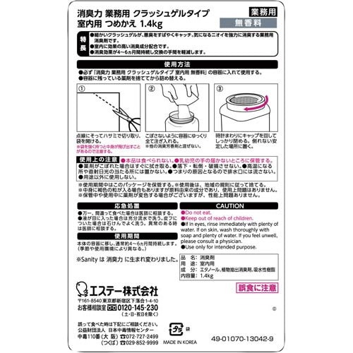 Sanityは消臭力に生まれ変わりました。細かいクラッシュゲルが、悪臭をすばやくキャッチ。気になるニオイを強力に消臭する業務用消臭剤です。