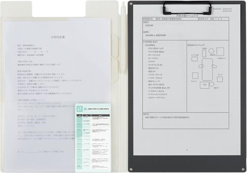 3段ポケットでカンタンに書類を整理できるクリップホルダー。アルコール、次亜塩素酸消毒可能!