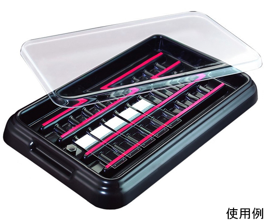 ●トレー内には4本のレールがあり、スライドガラスを2本のレールに橋を掛けるように置いて使用し、トレーがスライドから落ちる余分な染色液を保持します。